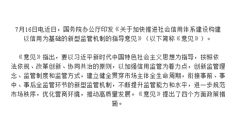 7月16日电近日,国务院办公厅印发《关于加快推进社会信用体系建设构建 以信用为基础的新型监管机制的指导意见》(以下简称《意见》)。